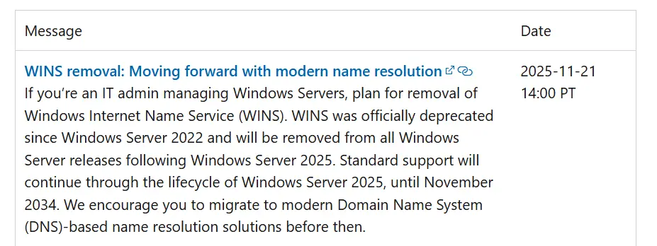 “WINS 已從 Windows Server 2022 開始正式棄用,並將從 Windows Server 2025 之後的所有 Windows Server 版本中移除。我們將持續提供 Windows Server 2025 的標準支持,直至 2034 年 11 月。我們建議您在此之前遷移到基於現代域名系統(DNS)的名稱解析解決方案。”