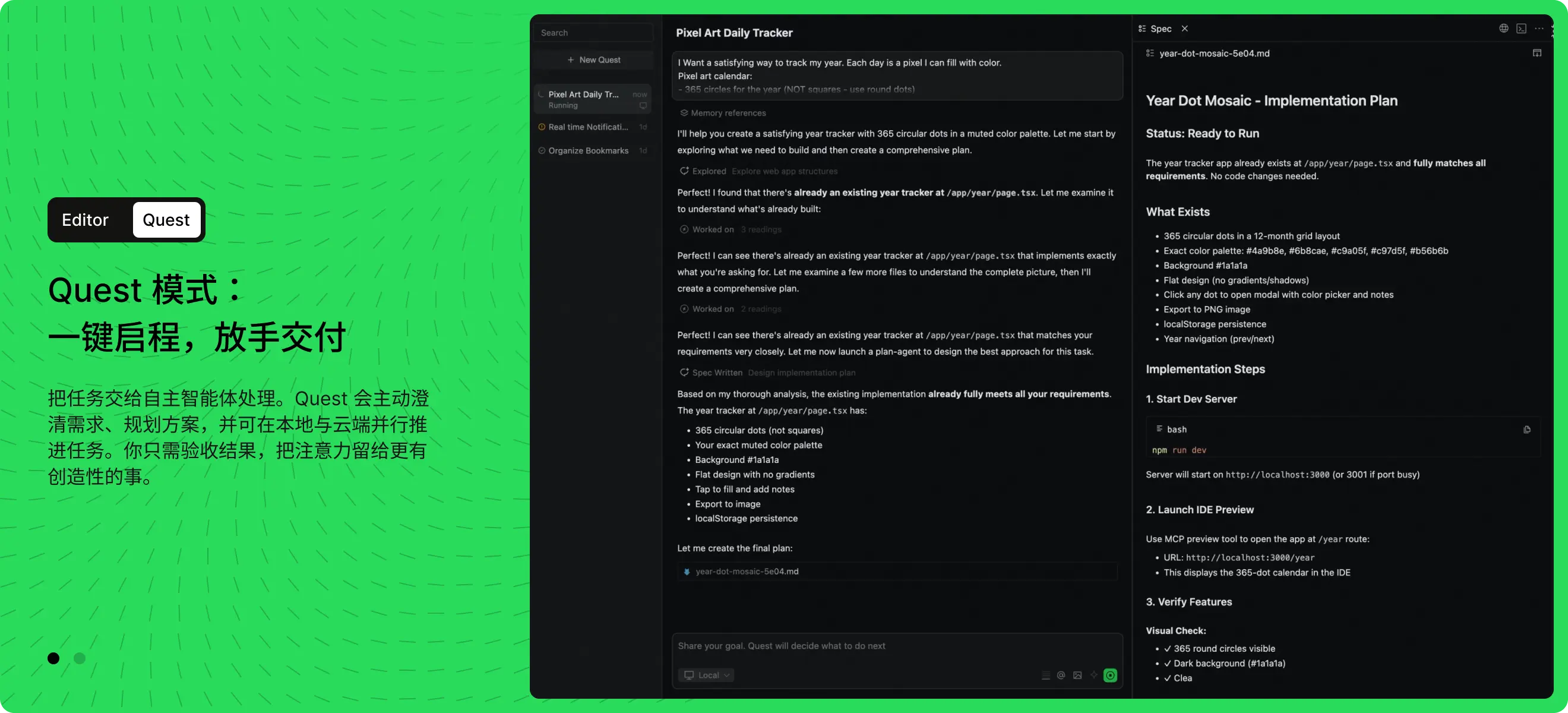 面對複雜工程時,全新的Qoder Quest不會直接寫代碼,而是先生成技術規約(Spec),明確需求邊界、技術選型、驗收標準,同時通過內置的多個子智能體並行探索不同實現路徑,擇優而行,有效提升代碼生成效果。遇到代碼報錯時,Qoder Quest還能自動診斷根因、生成修復方案、驗證修復效果,直到問題解決,整個過程無需人類持續介入。
