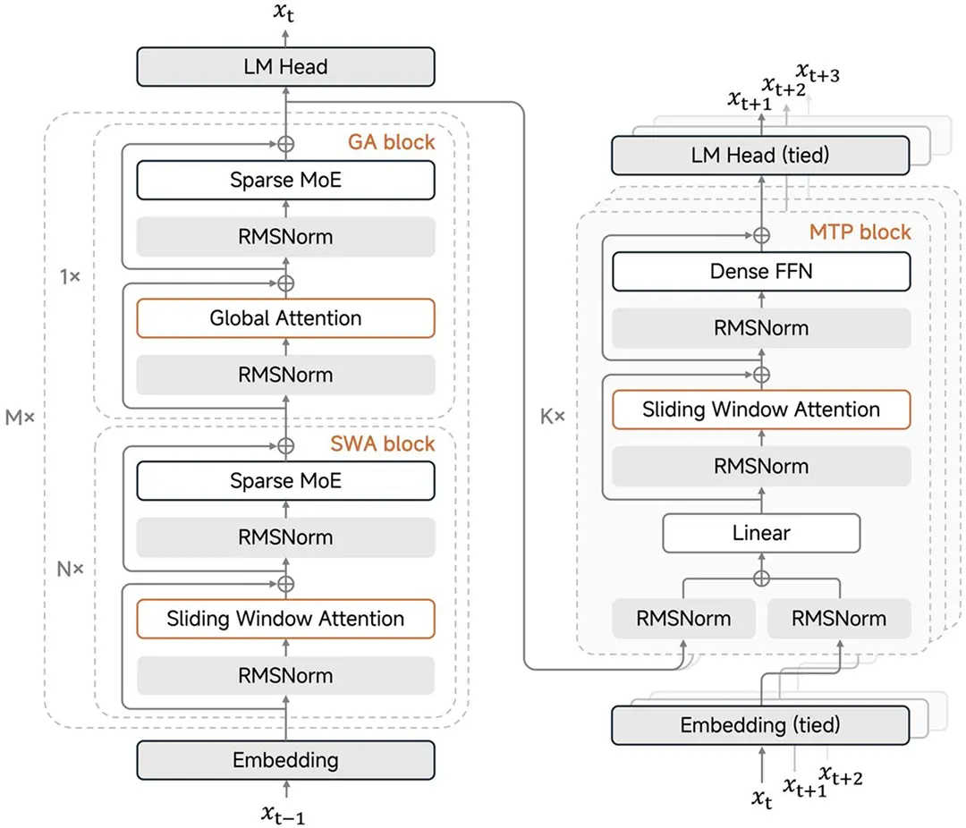 採用 5:1 的 Sliding Window Attention (SWA) 與 Global Attention(GA)混合結構,128 窗口大小,原生 32K 外擴 256K 訓練。經前期大量實驗發現,SWA 簡單、高效、易用,展現了比主流 Linear Attention 綜合更佳的通用、長文和推理能力,並提供了固定大小的 KV Cache 從而極易適配現有訓練和推理 Infra 框架。