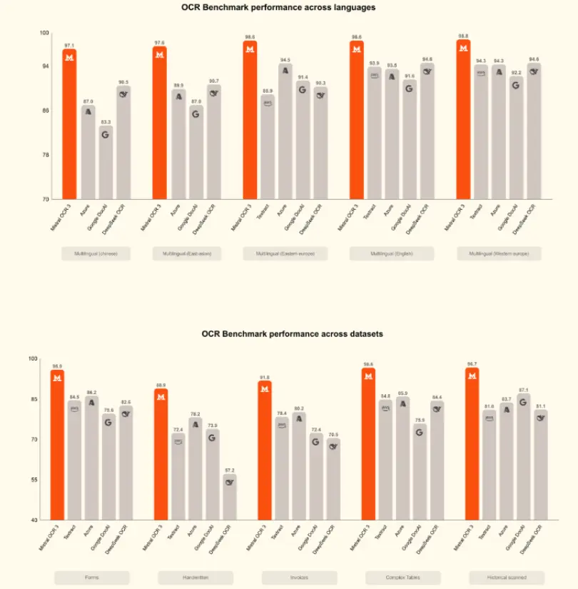 為了確保產品的準確性,Mistral OCR3引入了更具挑戰性的內部基準,專注於真實業務場景中的表現。與前幾代 OCR 模型相比,該技術在處理手寫識別、表單、掃描及複雜文檔等方面進行了顯著升級,適應了多種文檔類型的需求。