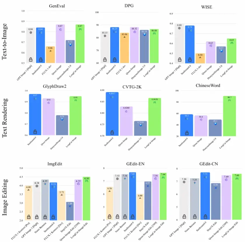 基準測評結果表明,在圖像編輯任務中,ImgEdit-Bench(4.50分)、 GEdit-Bench 中英文得分(7.60/7.64分)均達到開源SOTA水平,且逼近頭部閉源模型水平;在文字渲染方面,ChineseWord 評測以 90.7 分的成績大幅領先所有參評模型,實現常用字、生僻字的全量精準覆蓋;文生圖任務上,GenEval 0.87 分、DPG-Bench 86.8 分的表現,使其在生圖基礎能力上相比頭部開源與閉源模型依然具備強競爭力。