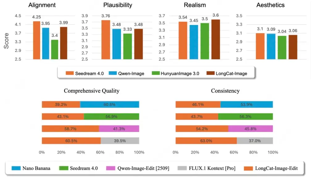 在圖像編輯方面採用嚴格的並列對比評估(Side-by-Side, SBS)方法,聚焦於綜合編輯質量、視覺一致性這兩個用户體驗的維度,評測結果表明,LongCat-Image 雖然與 Nano Banana、Seedream 4.0 等商業模型存在一定差距,但顯著超越了其他開源方案。
