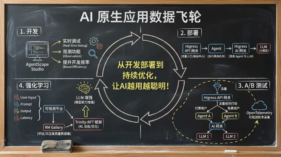 面對這一挑戰,AgentScope 提供了 Studio、RM Gallery 和 Trinity-RFT 等一系列生態工具,結合 Higress AI 網關和可觀測系統,您可以快速實踐 AI 原生應用數據飛輪。