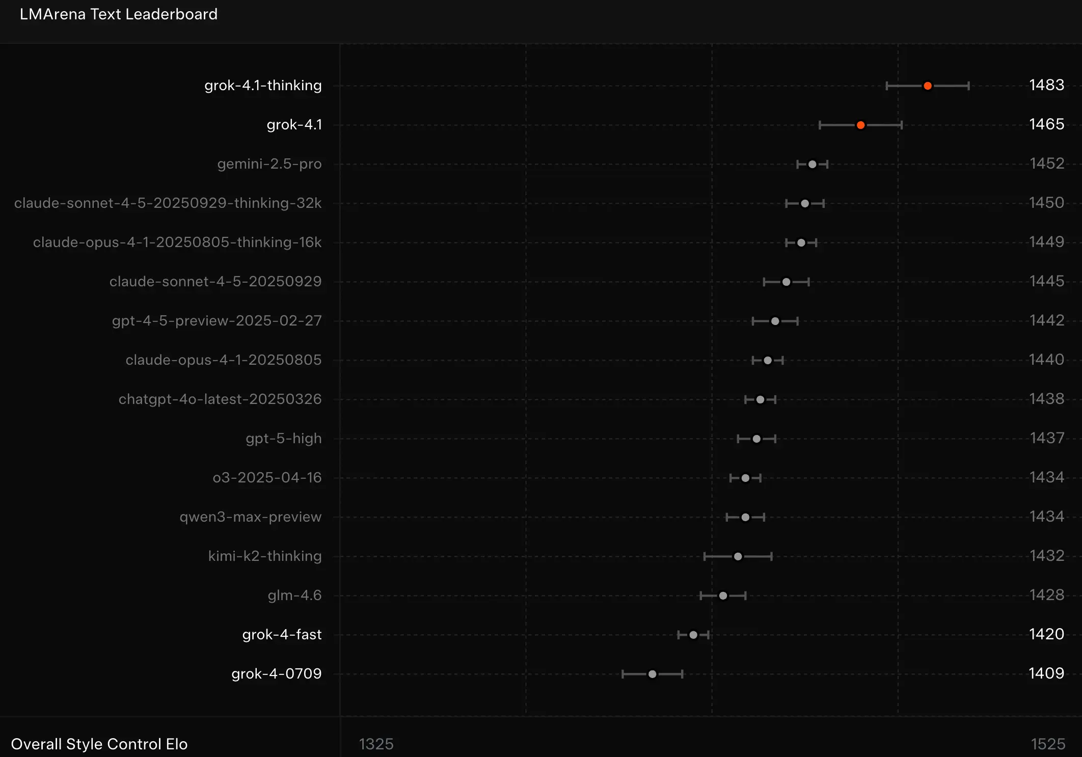 在 LMArena 的 “Text Leaderboard” 中,Grok 4.1 的 “thinking 模式”(代號