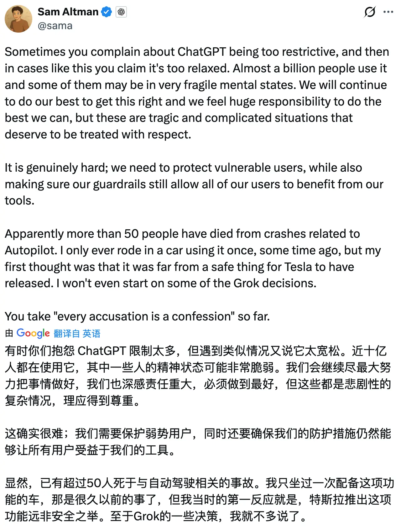 面對質疑,奧特曼迅速回應,一方面闡明OpenAI在產品安全上的立場,稱“保護易受傷害的用户與保障所有用户正常使用工具之間的平衡確實頗具挑戰,OpenAI始終重視安全防護工作”;另一方面,他轉而抨擊特斯拉的自動輔助駕駛技術(Autopilot),指出“已有超過50人死於與Autopilot相關的車禍”,並表示自己曾乘坐過搭載該系統的車輛,當時便認為其“遠算不上安全”。