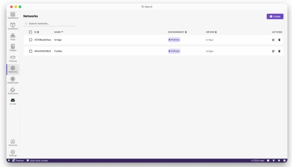 這次更新新增了一個專用的網絡頁面,讓 Podman 網絡管理直接集成在 Podman Desktop UI 中。之前管理網絡需要命令行操作,現在可以通過新頁面直觀操作。