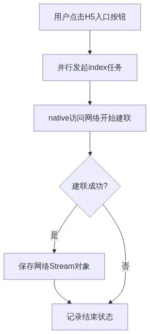 用户點擊H5入口按鈕,並行index任務發起,訪問網絡開始建聯,一但完成有效建聯,則保存網絡stream對象,當webview需要使用該數據流的時候,判定stream對象是否存在,如果存在,則直接使用該數據流,如果stream對象不存在,則判定網絡訪問是否返回,如果是因為網絡訪問失敗導致stream為空,則認為是並行任務失敗,否則會進入等待模式,等待模式下,線程建立一個循環體,每隔5ms,探測一次stream是否存在,網絡是否已完成建聯,一但探測到結果,則退出循環體,即使多次沒有探測到結果,1500ms後依然退出循環體,此時放棄並行任務數據,改為webview自主加載資源。