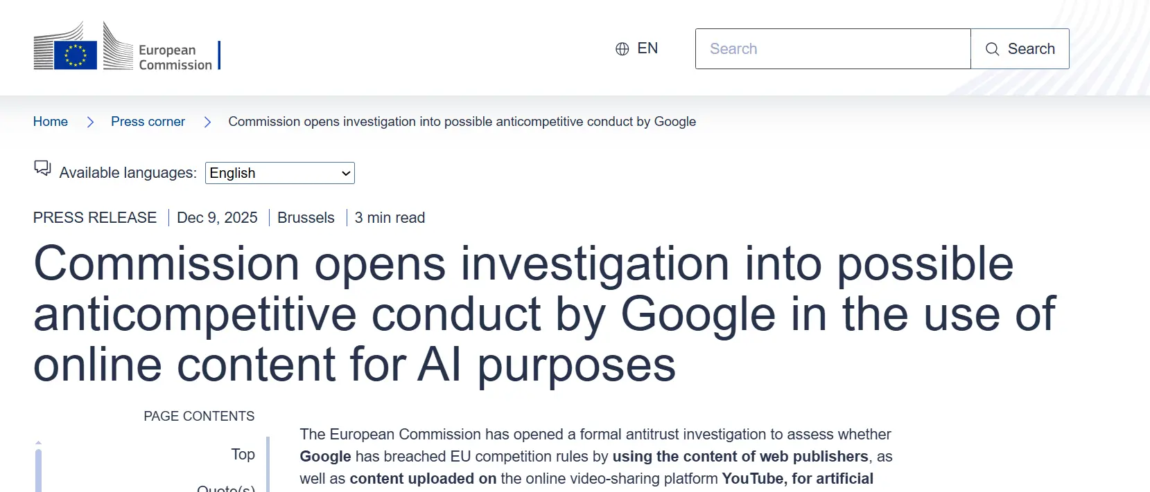 歐盟委員會宣佈已正式針對谷歌啓動了一項反壟斷調查,以評估谷歌是否違反歐盟競爭規則,將網絡出版商的內容以及在線視頻分享平台 YouTube 上上傳的內容用於其人工智能(AI)用途。