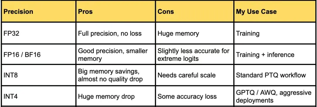 - 有時需要保留原精度層:LayerNorm、嵌入層(embedding layers)或語言模型頭(LM head)可能得保持在 FP16 精度