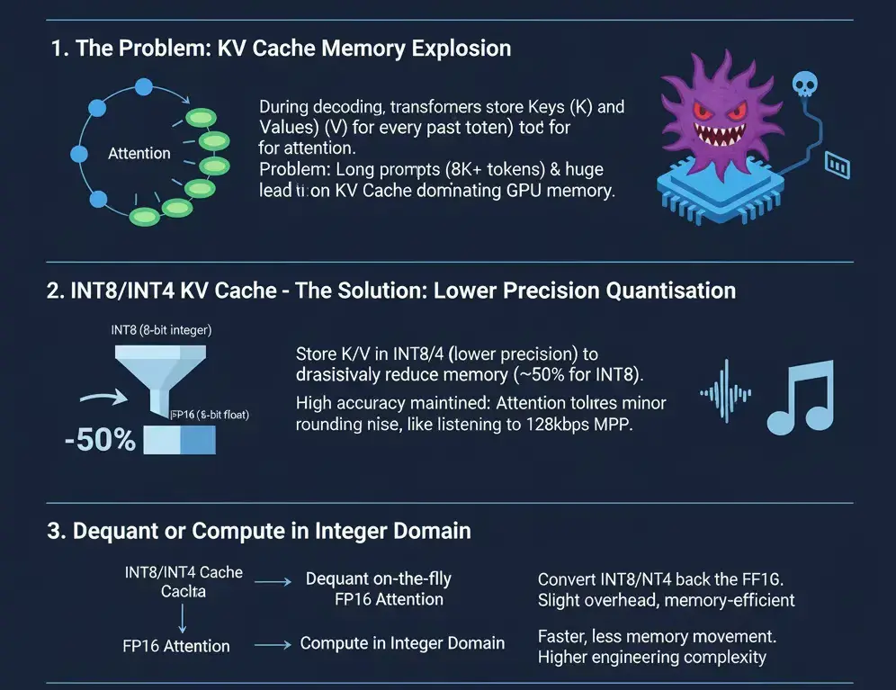 - 將鍵和值以更低精度(如 INT8 或 INT4)存儲,可大幅減少內存佔用。