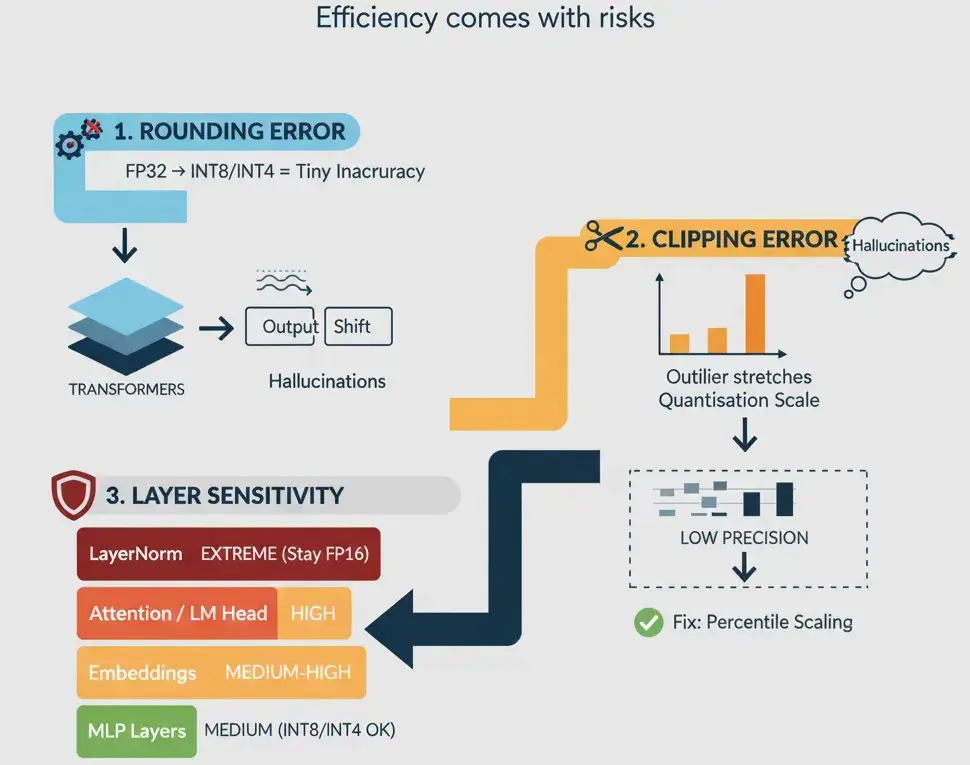 - 單次誤差很小,但在 Transformer 中,微小的取整誤差會跨層累積。