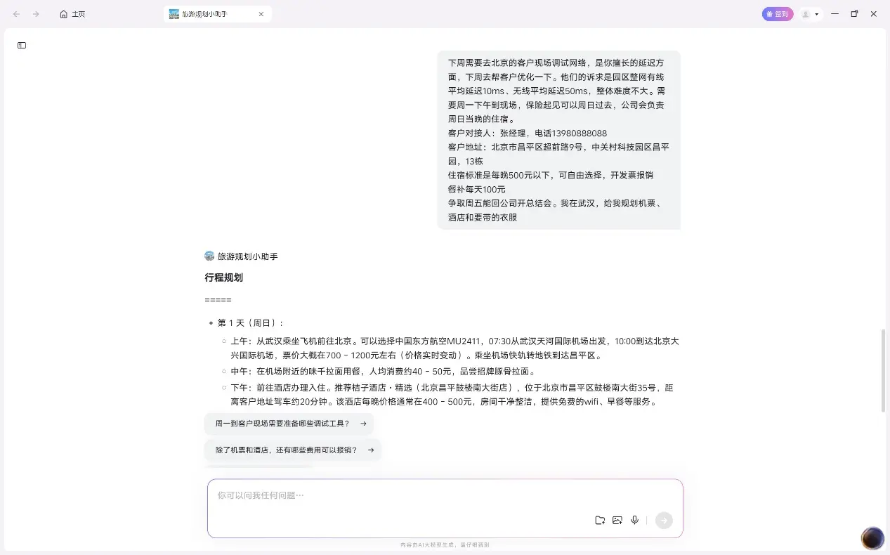 同樣以網絡工程師為例,我們可以將領導發的出差郵件文本複製到AI Space中由第三方提供的“旅遊規劃小助手”中,只需幾秒鐘,智能體便能給包括早晨的航班號、午飯的餐廳、晚上的酒店、需要帶的衣物等在內的詳細推薦。並且,這份行程規劃也能在安裝有天禧個人智能體的手機上被同步看到,方便直接下單訂機酒。
