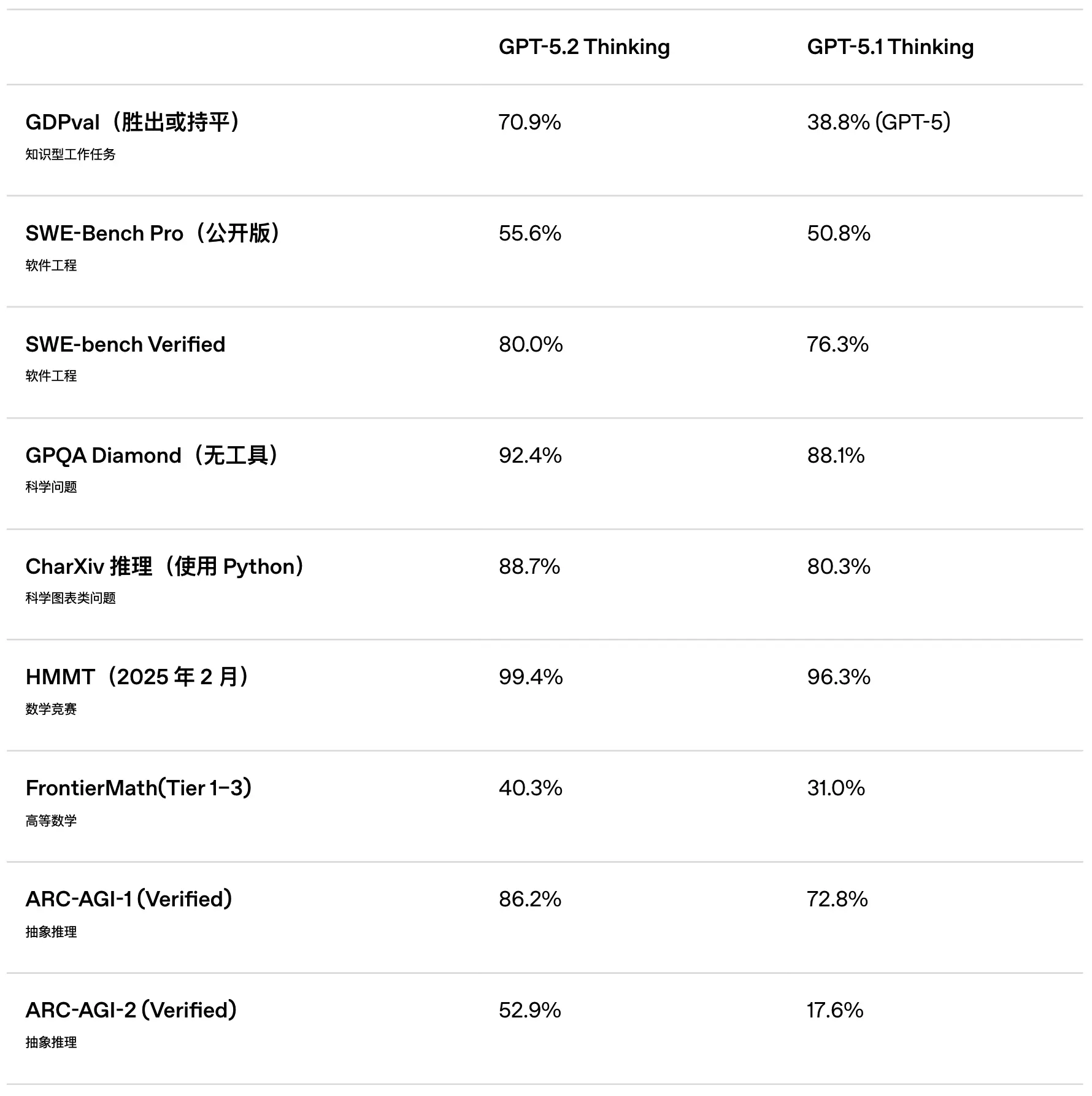 GPT-5.2 Thinking在GDPval評測中以70.9%的勝率超越行業專家,幻覺率降低38%,並支持高達256k Token的長上下文處理。
