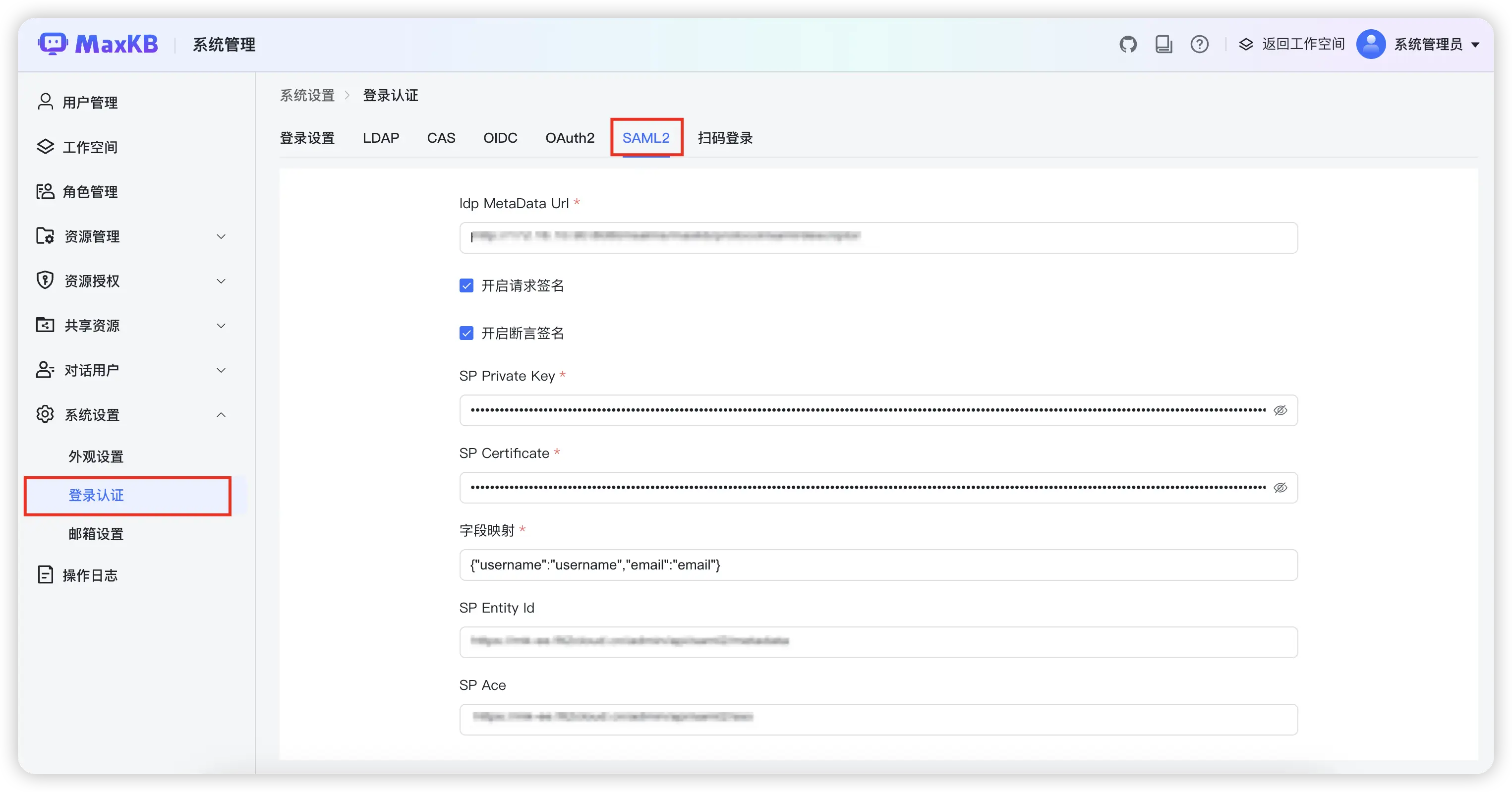 X-Pack 增強包方面,系統設置的登錄認證新增對 SAML2 單點登錄的支持。目前,MaxKB 已經全面兼容主流單點登錄協議,包括 CAS、OIDC、LDAP、OAuth2 和 SAML2。