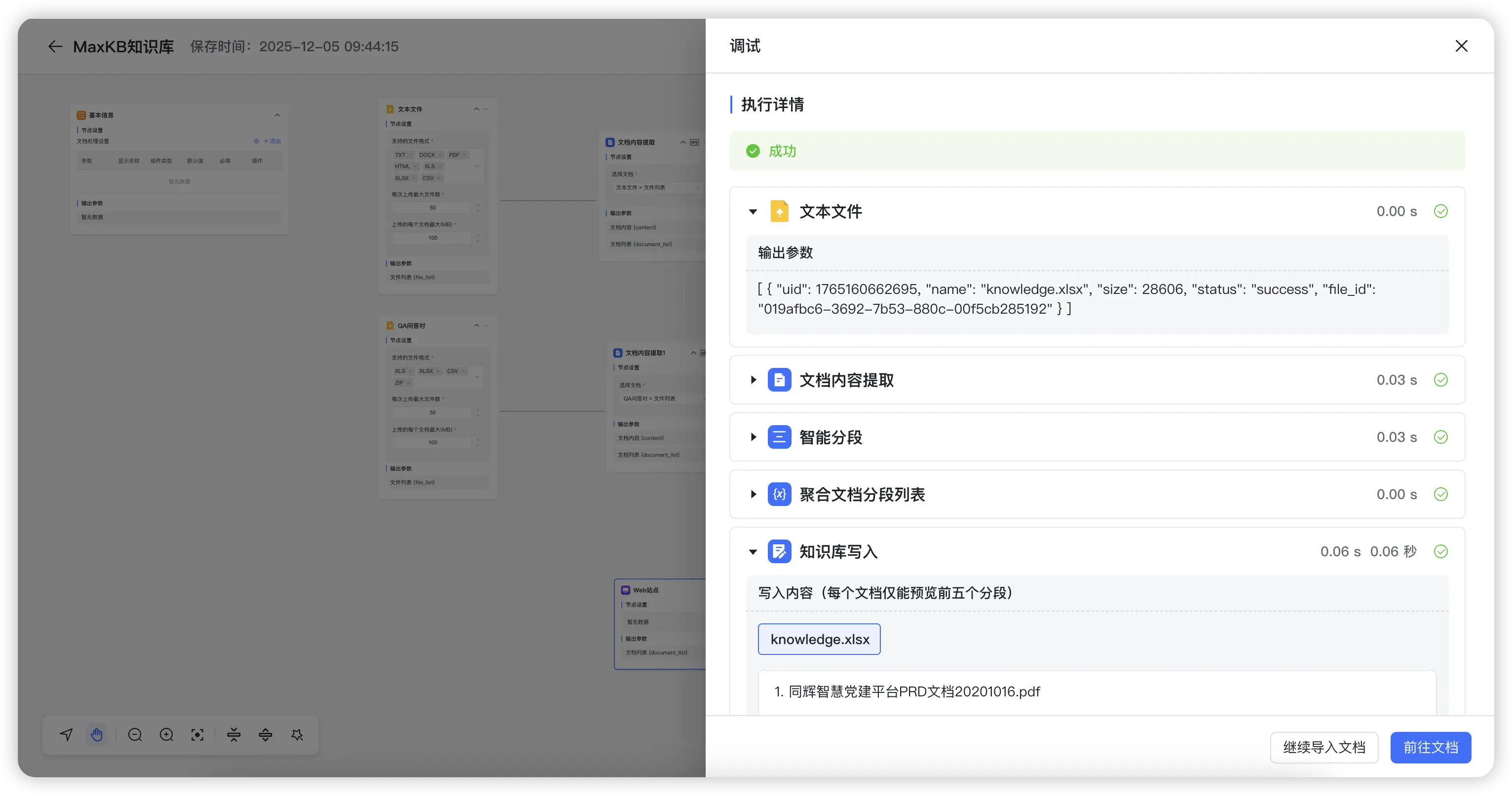編排完成後,點擊工作流知識庫頁面的 “調試” 按鈕,系統將按流程執行。用户可在 “執行詳情” 對話框中可查看各節點的運行狀態,例如數據源是否成功獲取文檔、解析工具是否正常提取內容、分段結果是否符合預期、寫入是否成功等。調試無誤後,點擊 “發佈” 按鈕,使該工作流將正式生效。