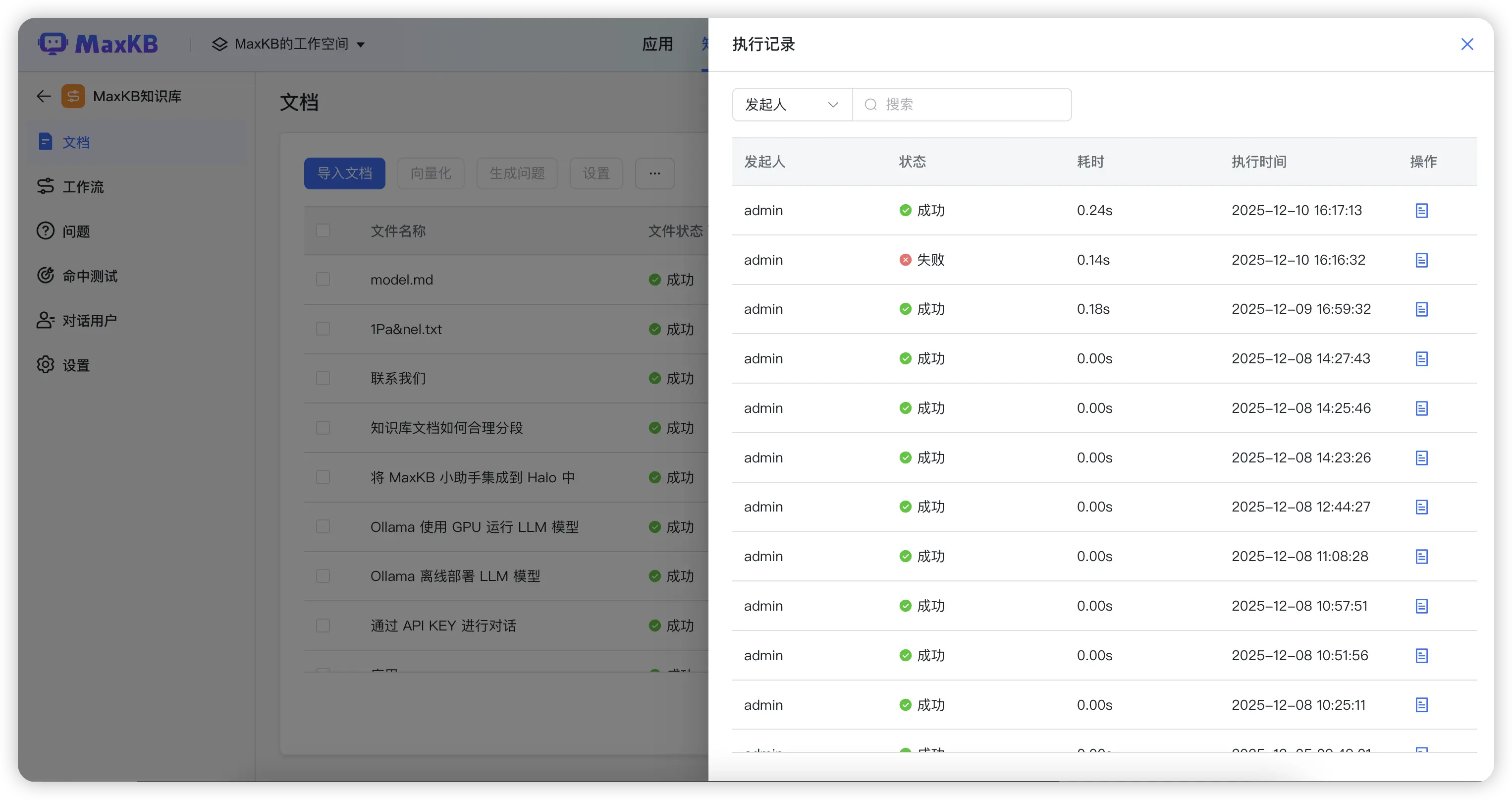需要注意的是,每次導入文檔的操作都會記錄在 “執行記錄” 對話框中,所有導入文檔操作均支持全鏈路追溯。