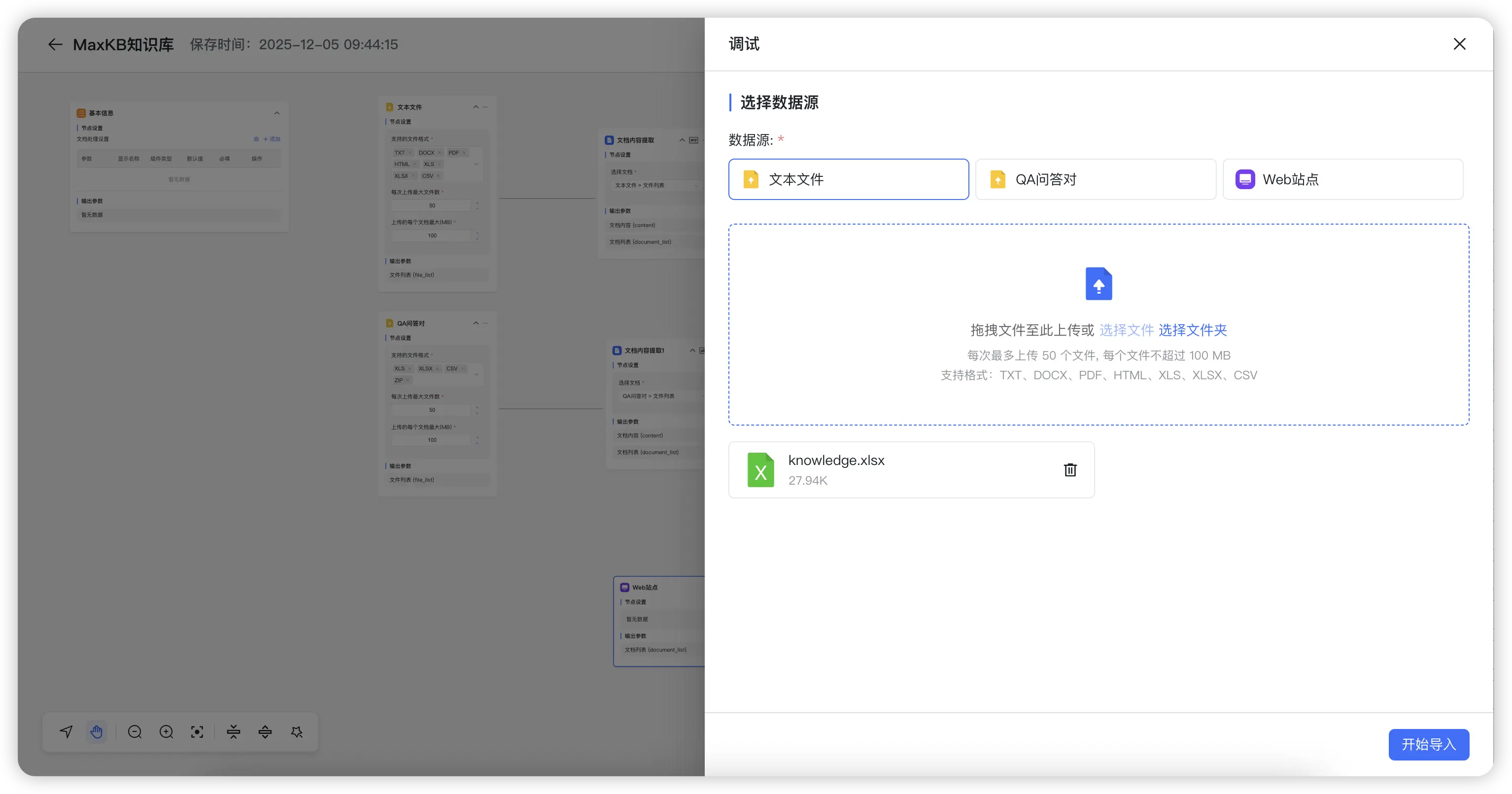 MaxKB v2.4.0 社區版新增工作流知識庫功能,允許用户通過拖拽節點的方式自主編排從不同數據源導入到知識庫寫入的全流程,滿足企業個性化知識管理需求。工作流知識庫的使用步驟為:創建工作流知識庫→編排工作流→調試併發布工作流→導入文檔。以下是每個步驟的詳細介紹: