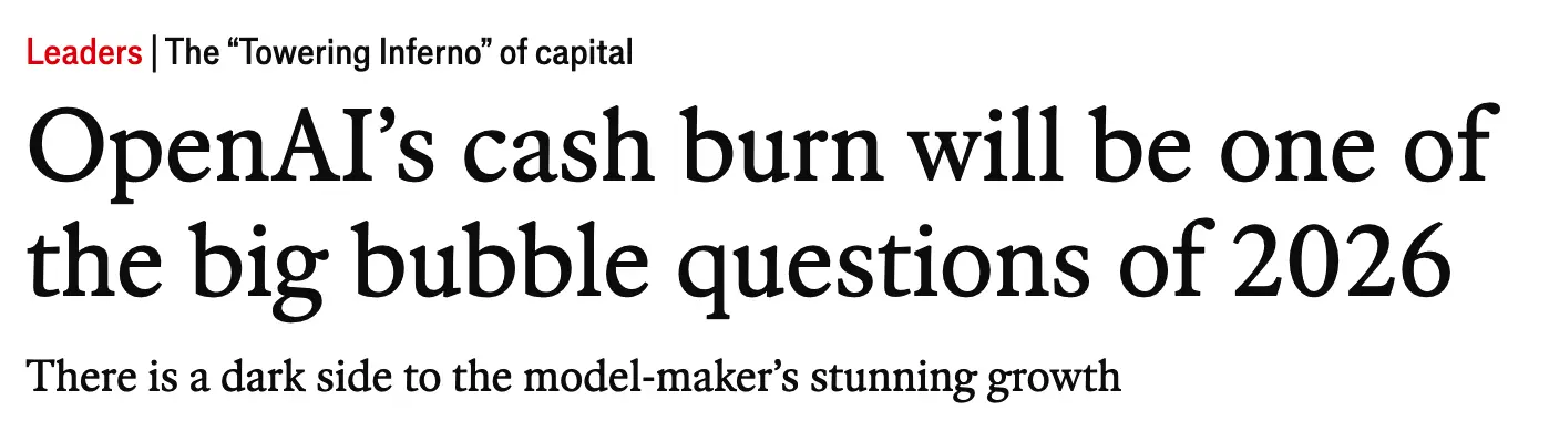 《經濟學人》近日發文指出,OpenAI 的高額現金消耗將成為 2026 年生成式 AI 行業面臨的關鍵拷問之一。隨着 AI 投資熱潮持續升温,OpenAI、Anthropic 等頭部模型公司不斷刷新融資規模預期,但隨之而來的算力、訓練和推理成本也在快速膨脹,引發市場對其長期可持續性的關注。