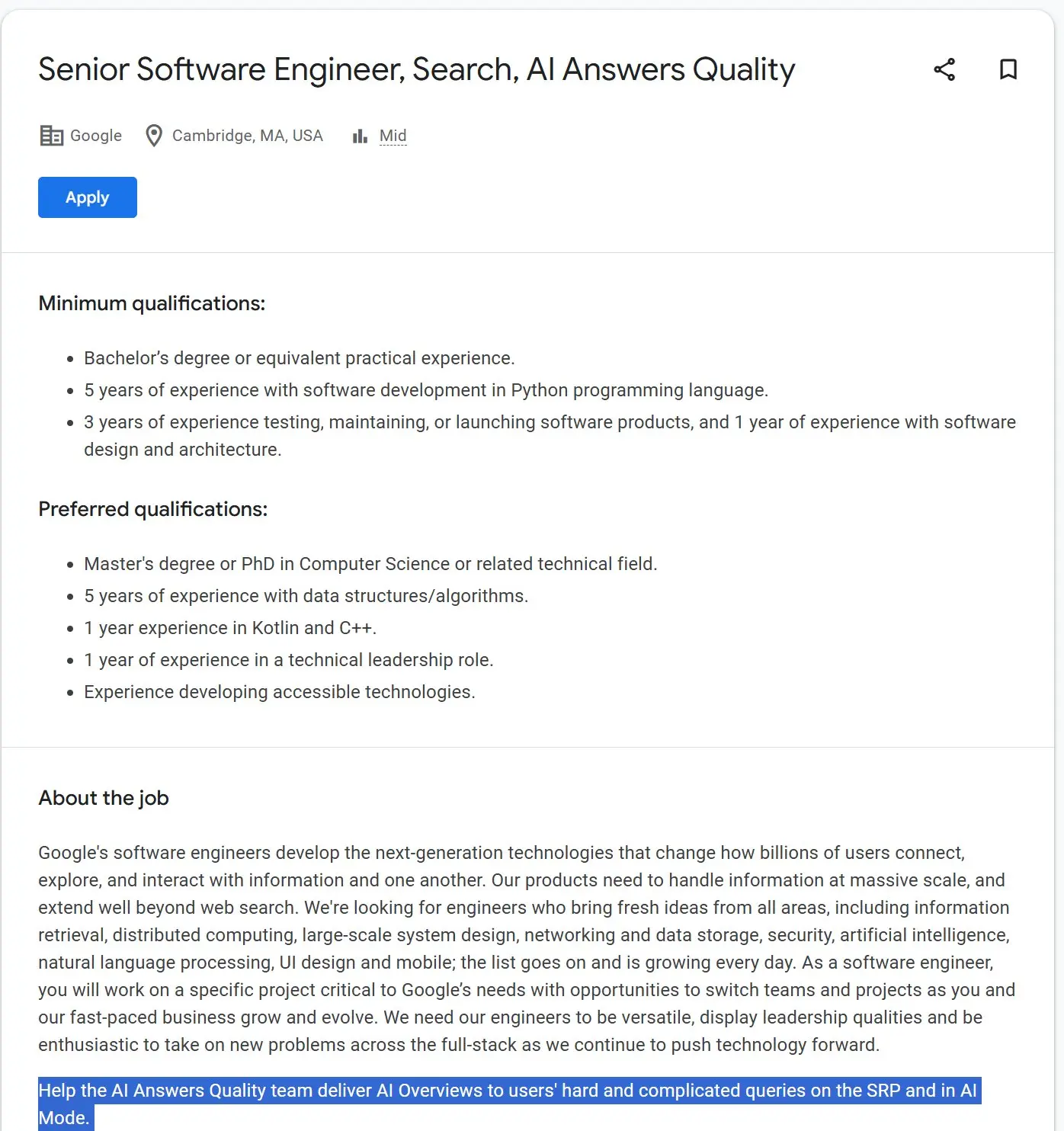 據Bleeping Computer報道,谷歌正在招聘“AI Answers Quality”工程師,旨在提升其搜索產品中AI Overviews的回答準確性與可靠性。