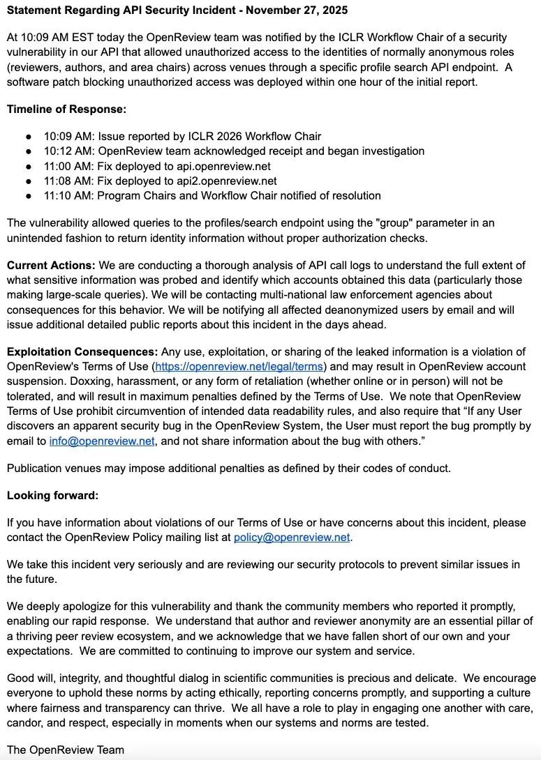 OpenReview 隨後發佈了一份 API 安全事件的聲明: