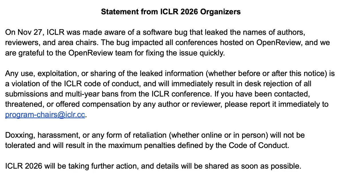 AI 領域頂級學術會議 ICLR 2026 組織者關於 OpenReview 重大數據泄露事件的緊急聲明: