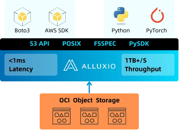 Alluxio 作為貼近計算部署的數據加速層,位於計算層與OCI 對象存儲層之間,通過智能地管理跨內存與 NVMe 的數據,同時通過 POSIX 和 S3 API 嚮應用程序提供統一的命名空間。