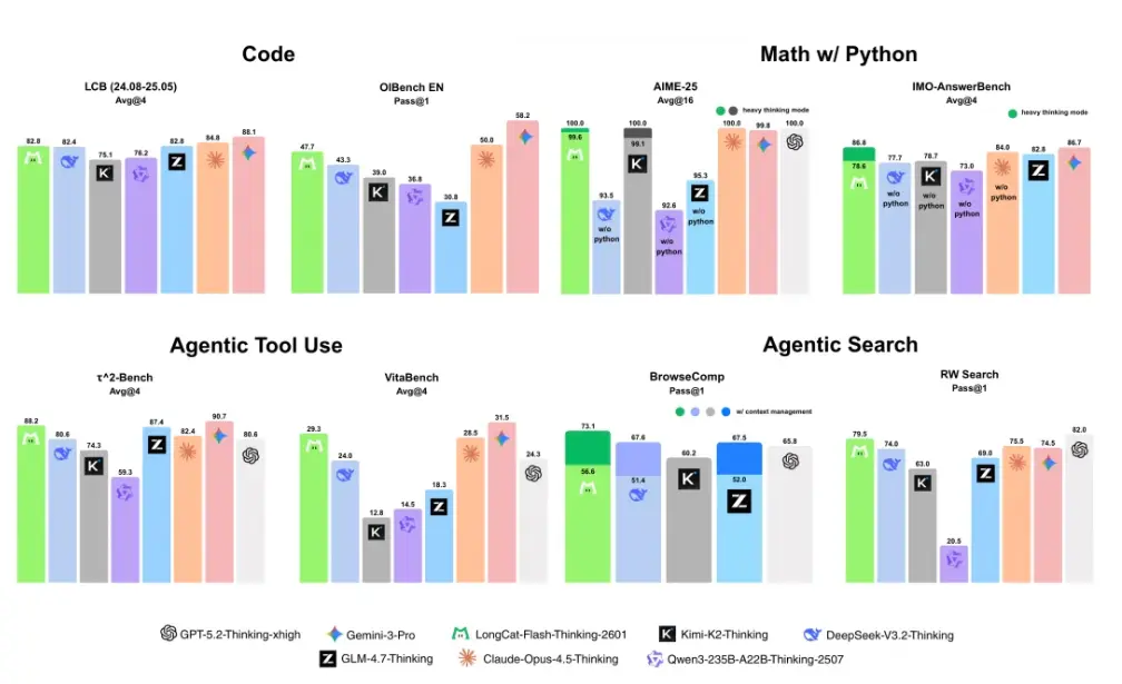 評測結果顯示,LongCat-Flash-Thinking-2601 模型在編程、數學推理、智能體工具調用、智能體搜索維度表現全面領先: