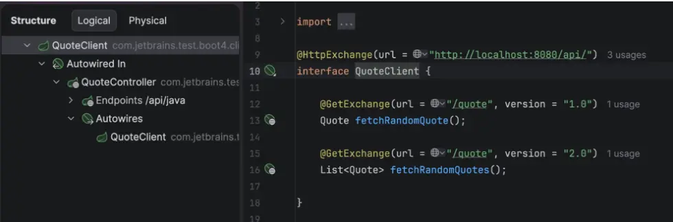 目前,要支持 HTTP Interface client 的版本控制,仍然需要手動編寫配置。IntelliJ IDEA 2025.3 將 HTTP 接口識別為 bean —— 不再出現“紅色波浪線”或“無法解析 bean”的警告。無論在何處使用這些客户端,都將獲得完整的自動補全、導航和注入支持。