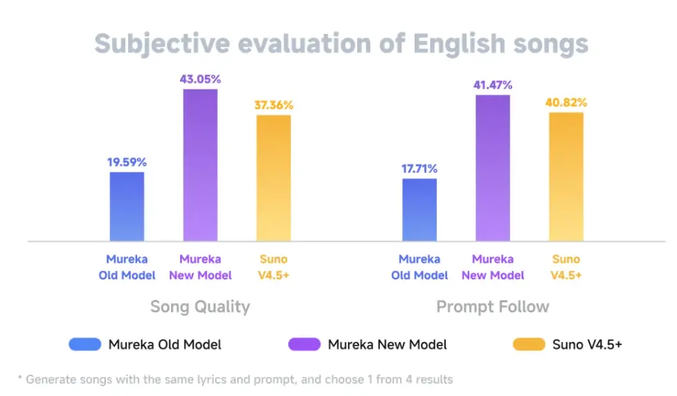 Mureka全新模型以“性能、速度、穩定性”為核心優化方向,性能升級包括: