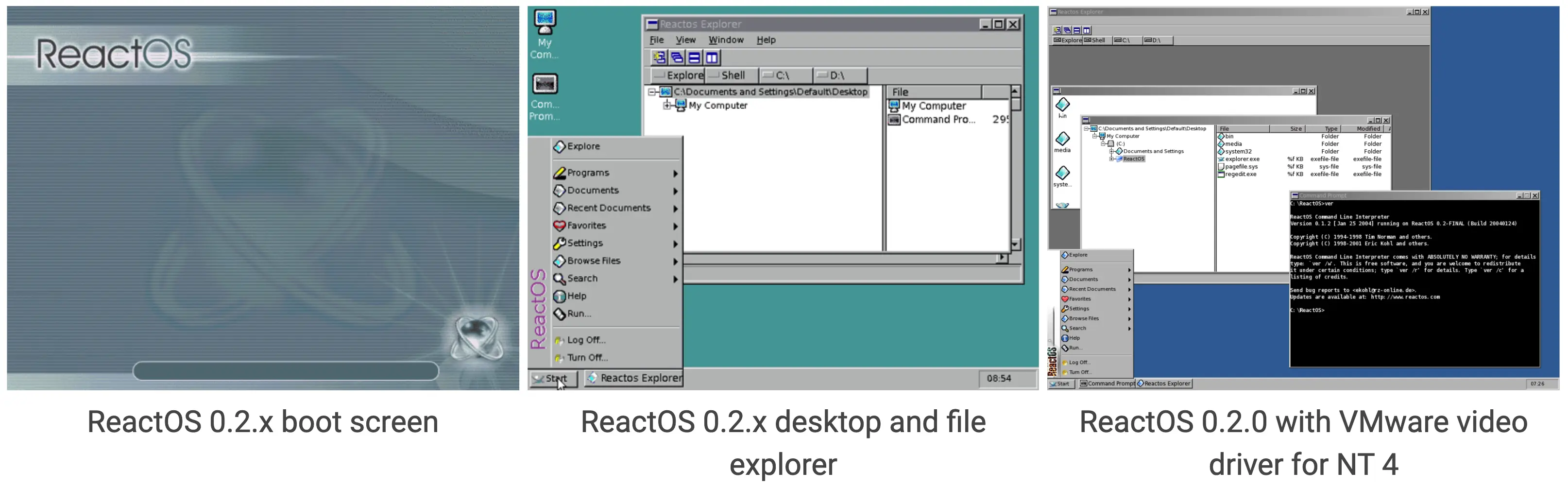 2003 年 2 月 1 日發佈 ReactOS 0.1.0,首次實現從光盤引導,但僅有命令行界面,尚不具備圖形桌面。