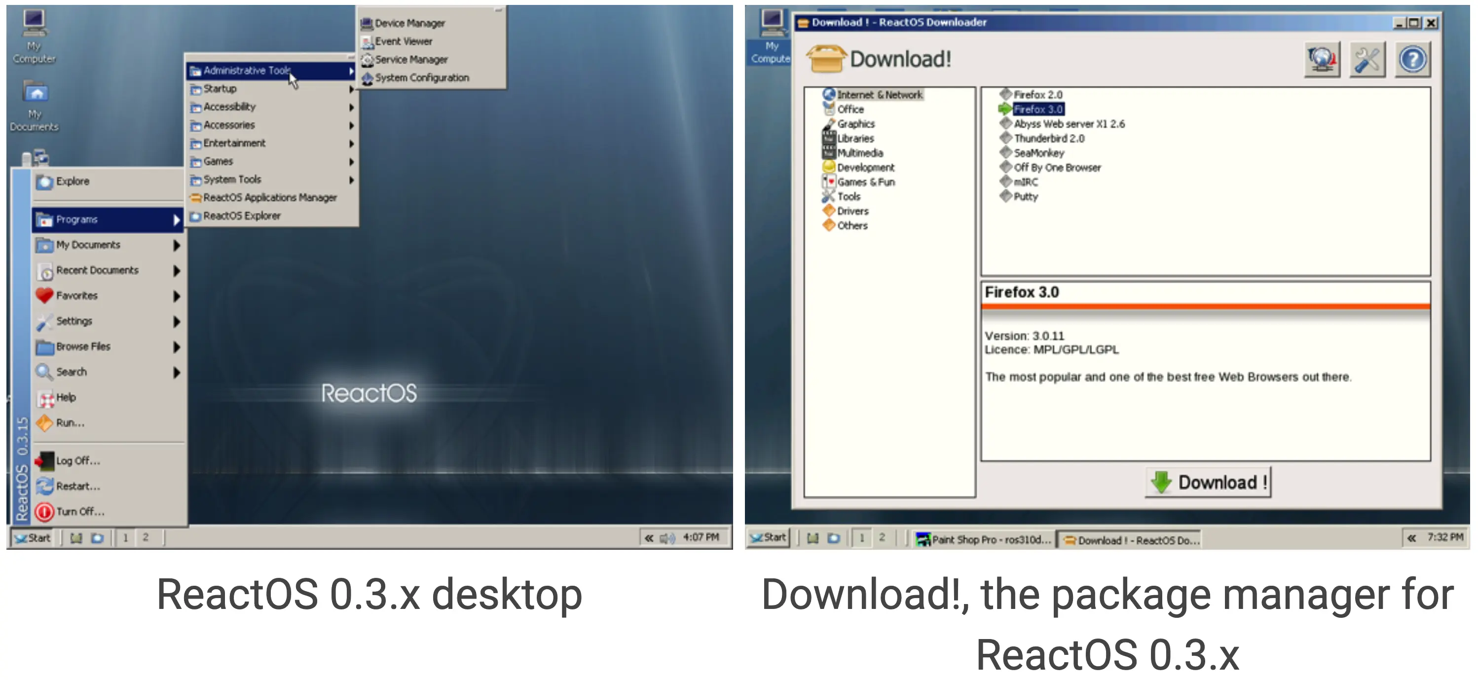 在 0.2.x 和 0.3.x 版本週期,ReactOS 實現了基本桌面、網絡支持和包管理器等功能,同時 x86_64 架構支持也啓動。