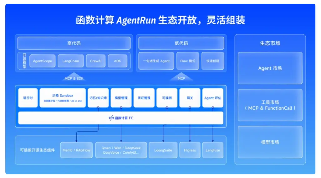 AgentRun僅需幾行代碼,即可快速集成AgentScope、Langchain、ADK、CrewAI等主流Agent開發框架;支持無代碼快速構建Agent,以及一鍵轉換為高代碼Agent,實現更敏捷的工程化開發;深度集成LiteLLM、Mem0、RagFlow等開源生態組件,提供雲端託管或私有化部署,確保技術自主與數據安全。