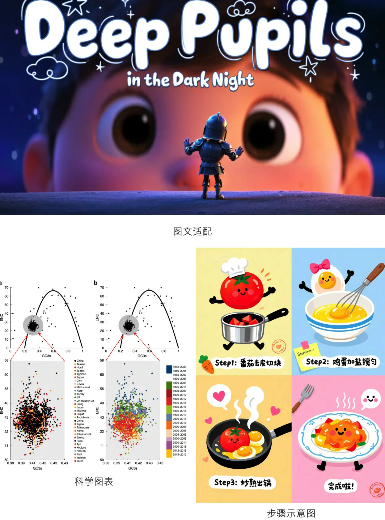 可依據中英文長文本內容,結合美學設計與圖文協調性,精準生成海報、圖文説明、信息圖表等,實現內容與視覺的高度統一。
