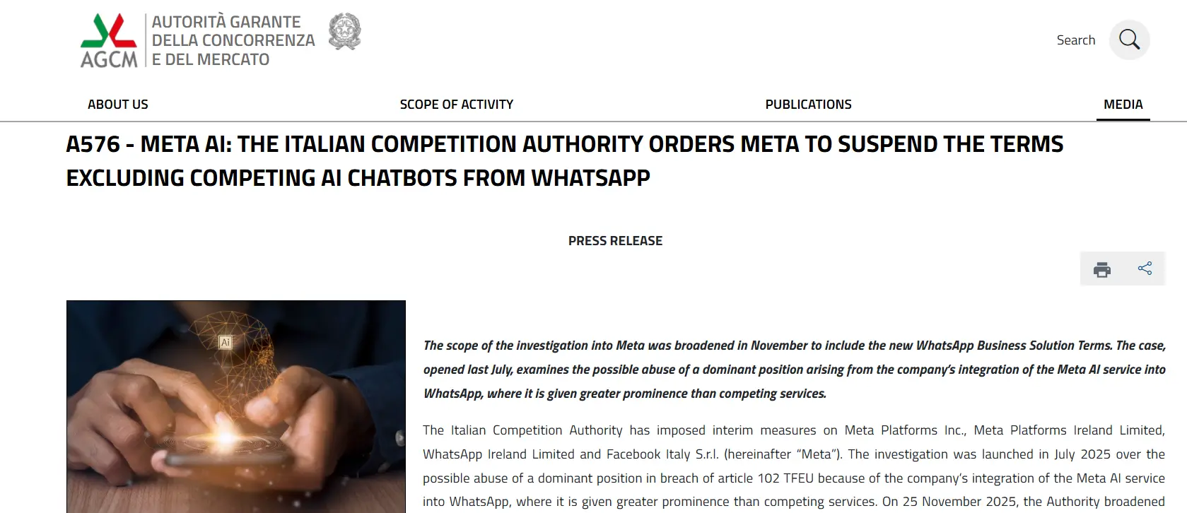 意大利競爭管理局(AGCM)近期正式發佈命令,要求Meta立即暫停其在WhatsApp商業平台上禁止第三方 AI 聊天機器人接入的新政策。監管部門認為,這一做法涉嫌濫用市場支配地位,阻礙了 AI 市場的公平競爭。