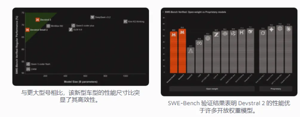 與此同時,參數量較小的Devstral Small2擁有240億個參數,專為在標準硬件上本地優化運行而設計。這款輕量級模型以其性能尺寸比突顯了其高效性。