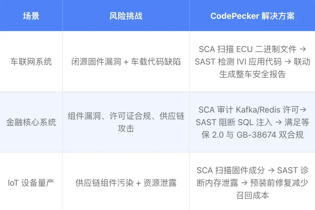 支持源碼與二進制混合掃描,適配 APK、ECU、IoT 固件、Docker 鏡像等非源碼場景;