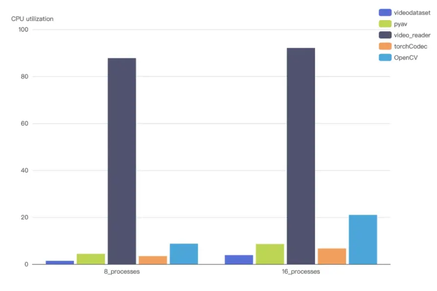 結果顯示,VideoDataset與主流 CPU 軟件解碼方案對比,在解碼吞吐量上提升了3到4倍。並且,它能更有效地分擔計算負載,從而將解碼任務近乎剝離CPU。這一優勢使得 VideoDataset 在大規模視頻數據訓練中不僅能提供更高的解碼效率,還能最大限度地利用GPU資源,提高整體訓練效率。