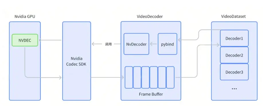 VideoDataset 基於 NVIDIA Video Codec SDK 進行封裝,通過多解碼器(Decoder)調度和生產者—消費者模型等多種手段實現瞭解碼與訓練的完全異步流水線,使解碼器利用率達到 90% 以上,提升瞭解碼性能和吞吐量。