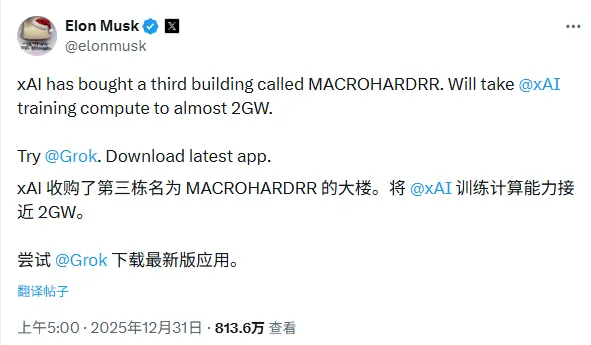 馬斯克宣佈公司已成功收購第三棟建築,用於擴充其位於田納西州孟菲斯市的基礎設施。此次擴張的核心目標是將模型訓練算力提升至近 20 億瓦(2GW)。