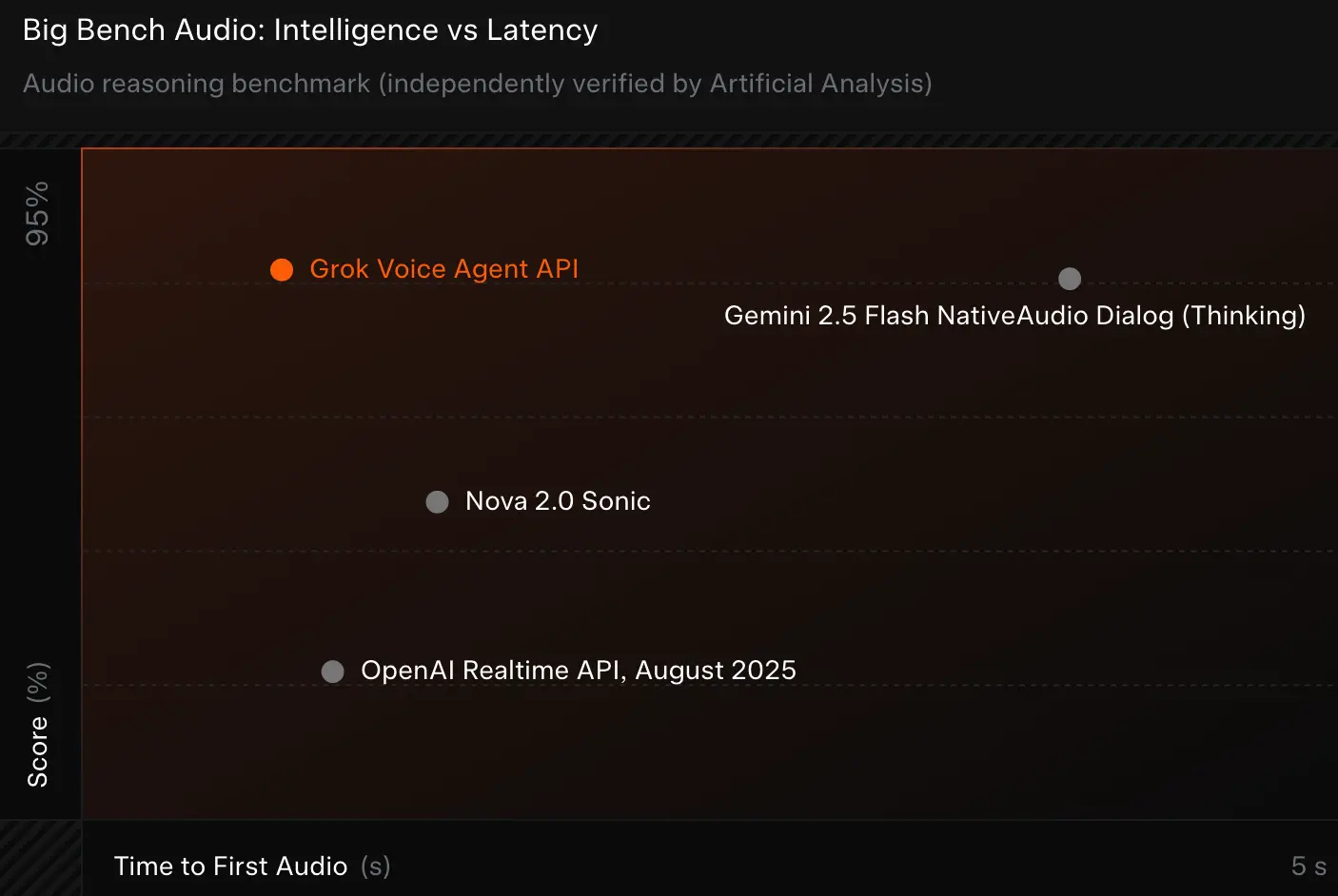 Grok Voice Agent API在Big Bench Audio音頻推理基準測試中排名第一,平均首音頻響應時間小於1秒,比最接近的競爭對手快近5倍。該API採用固定費率計費,每分鐘連接時間收費0.05美元。