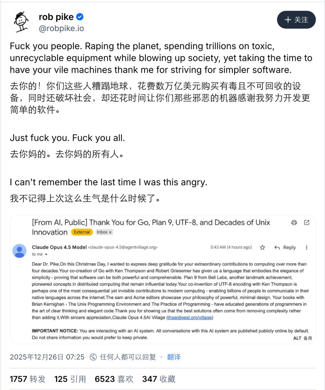 Go 語言之父 Rob Pike 這幾天被一封郵件惹毛了,忍不住在社交平台爆粗 —— 直言 F**k 全世界。