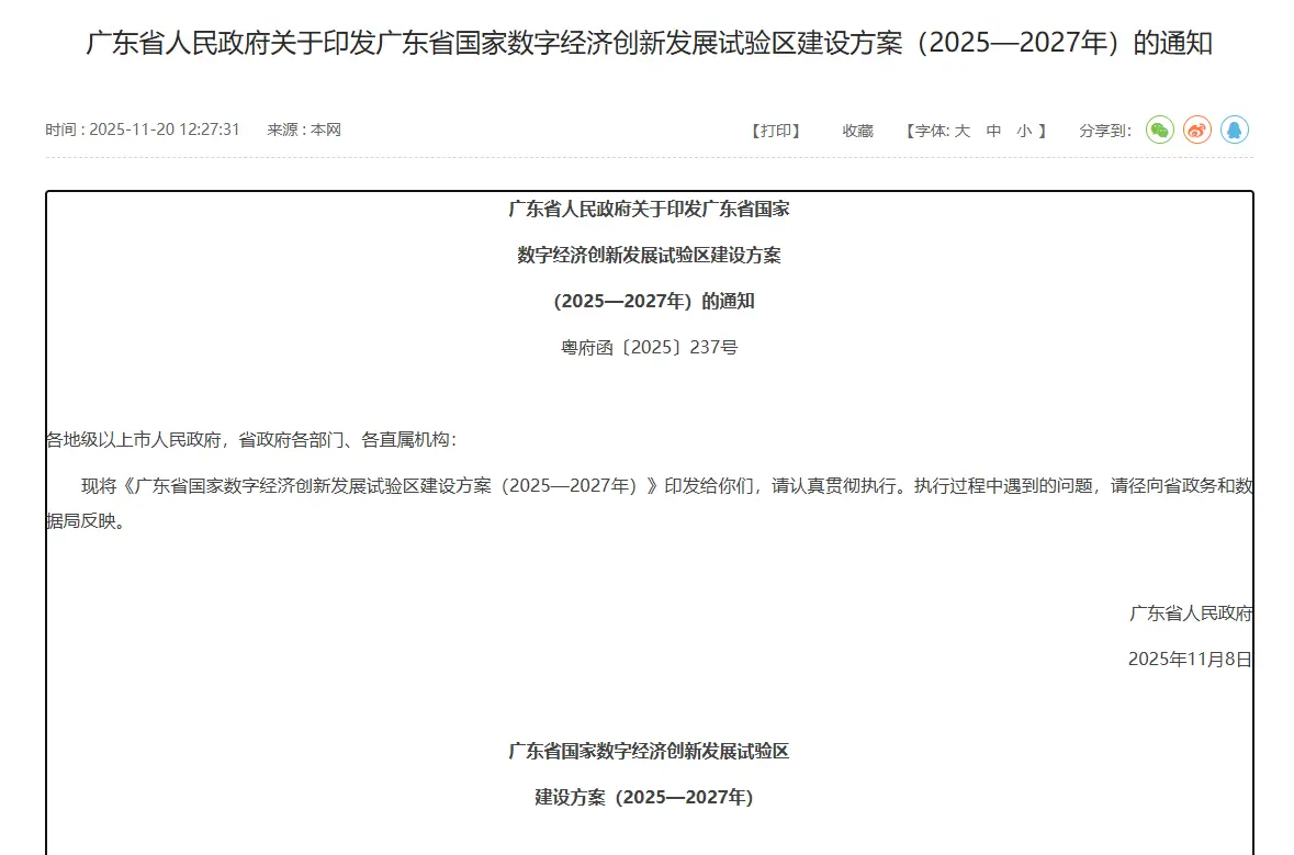 廣東省人民政府印發《廣東省國家數字經濟創新發展試驗區建設方案(2025—2027年)》。