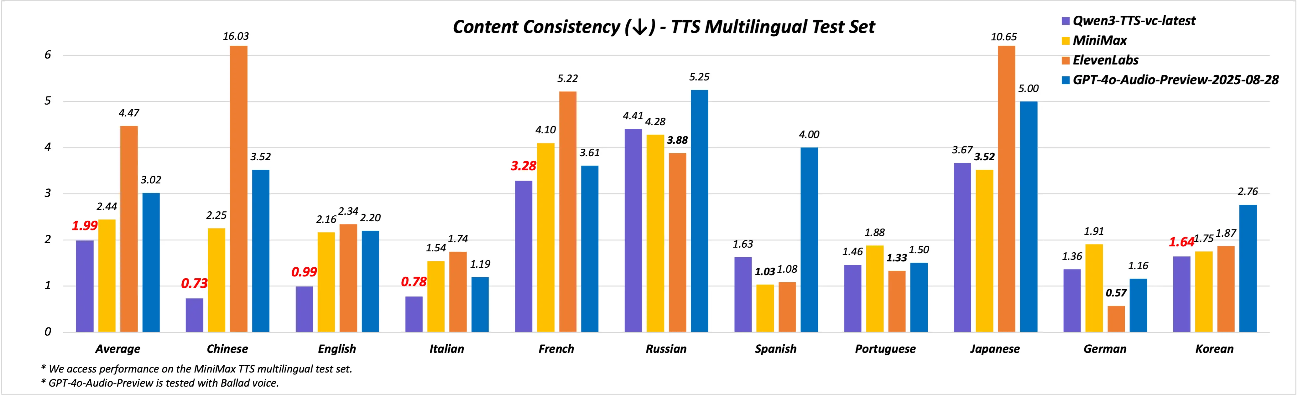 音色克隆:Qwen3-TTS-VC-Flash 支持3s級別音色克隆,並且可以基於克隆的音色生成中文、英文、德語、意大利語、葡萄牙語、西班牙語、日語、韓語、法語、俄語等10大主流語言。在MiniMax TTS Multilingual Test Set上,平均詞錯誤率(WER)全面優於MiniMax、ElevenLabs及GPT-4o-Audio-Preview。