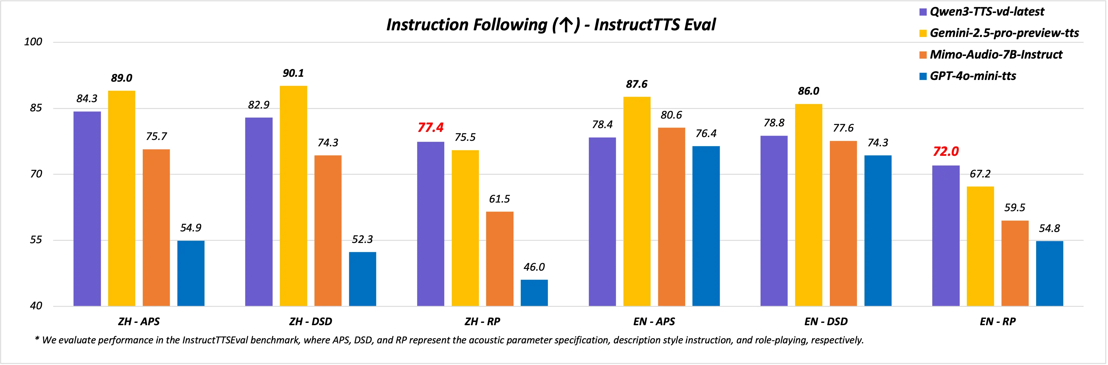 音色創造:Qwen3-TTS-VD-Flash 支持複雜自然語言指令輸入,實現對音色、韻律、情感、人設等的精細化調控,實現從“説什麼”到“如何説”的全面掌控,可以讓用户自由的定義想要的音色,徹底擺脱只能進行根據已有的音色進行克隆或者只能選擇固定的一部分預設音色。在 InstructTTS-Eval 中綜合表現顯著優於 GPT-4o-mini-tts、Mimo-audio-7b-instruct,在角色扮演測試中也超越 Gemini-2.5-pro-preview-tts。