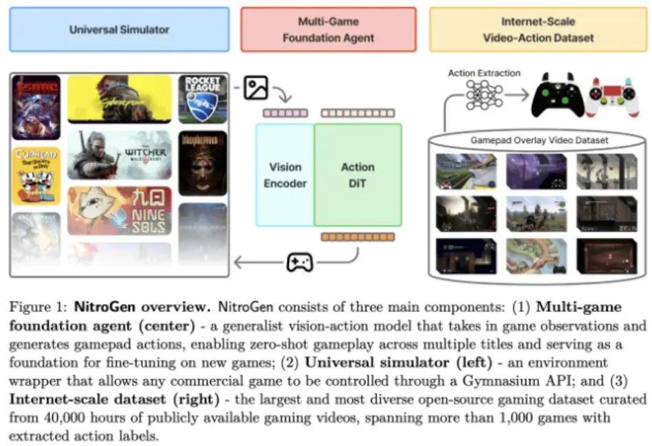 NVIDIA 的人工智能研究團隊近日推出了 NitroGen,這是一款針對通用遊戲代理的開放視覺行動基礎模型。NitroGen 能夠從網絡視頻中直接學習如何通過遊戲畫面和手柄操作來玩商業遊戲,整個模型經過40000小時的遊戲體驗訓練,覆蓋了超過1000款遊戲,同時還提供了開放數據集、通用模擬器和預訓練策略。
