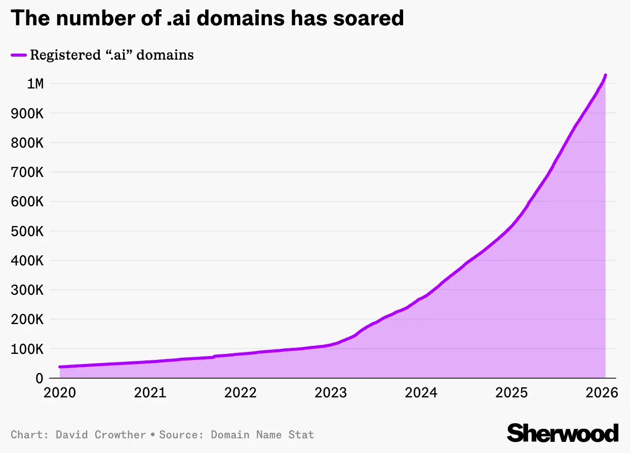 最新數據顯示,原本分配給英國海外領地安圭拉的國家頂級域名“.ai”,在生成式人工智能熱潮的帶動下,正成為這個人口僅約1.5萬的小島的重要“新礦”。根據域名統計機構 Domain Name Stat 數據,“.ai”域名數量已在今年1月2日突破100萬,這一爆發式增長緊隨 ChatGPT 在2022年底上線後,全球企業與開發者搶注與 AI 相關域名的浪潮。