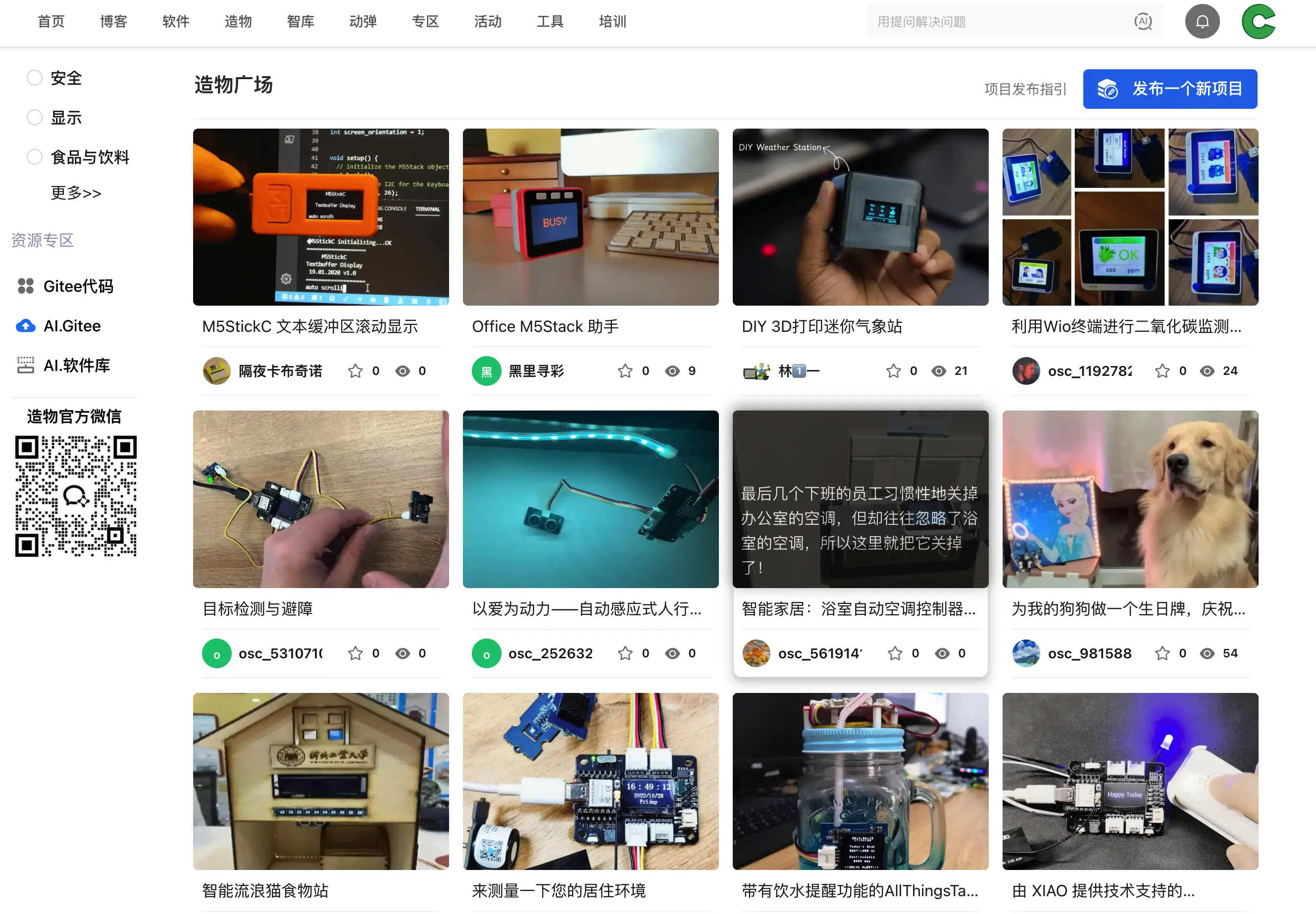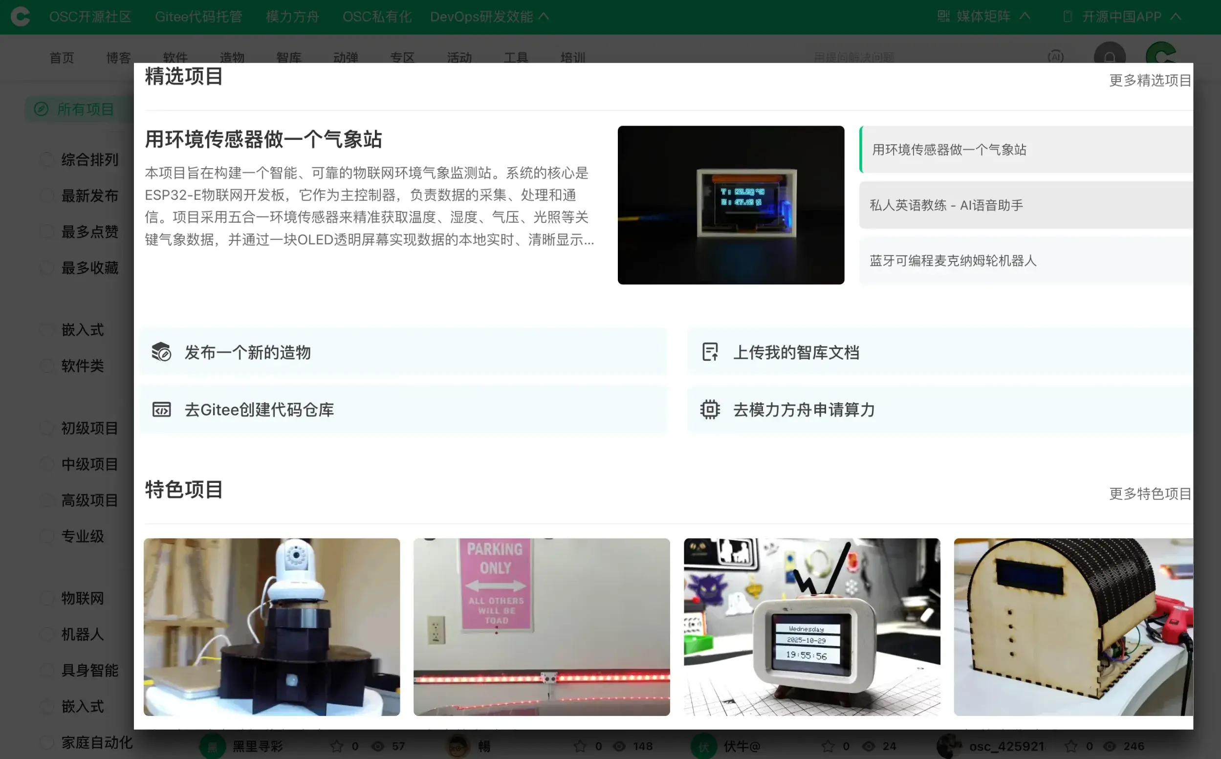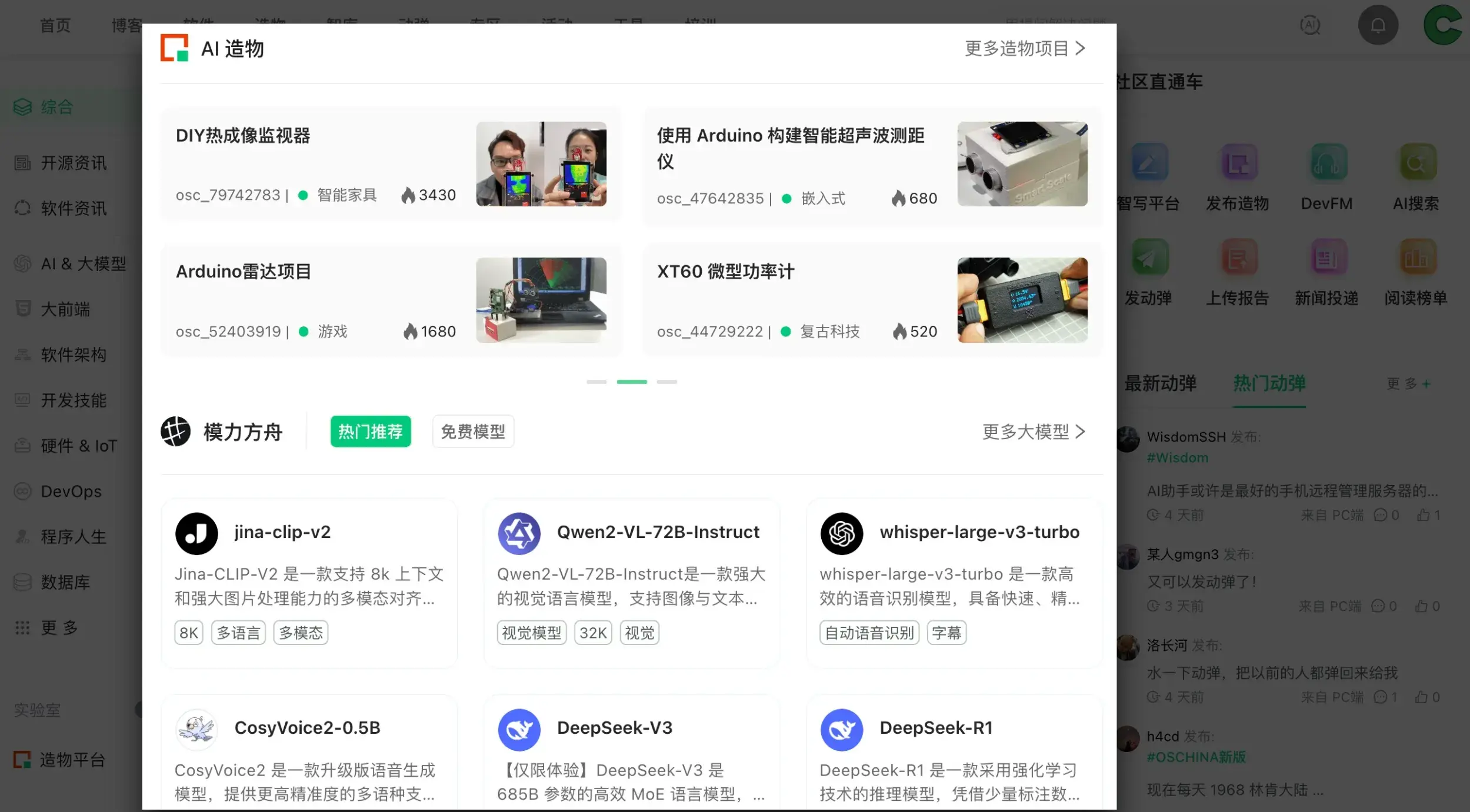 AI 造物社區,一個以(硬件類)技術項目為核心的一站式創新平台,依託 OSCHINA 的龐大開發者生態和 Gitee 的研發工具能力,深度整合模力方舟(Gitee AI)的大模型資源、數據集與算力,為創客和創業團隊提供全棧式 AI 產品化解決方案。