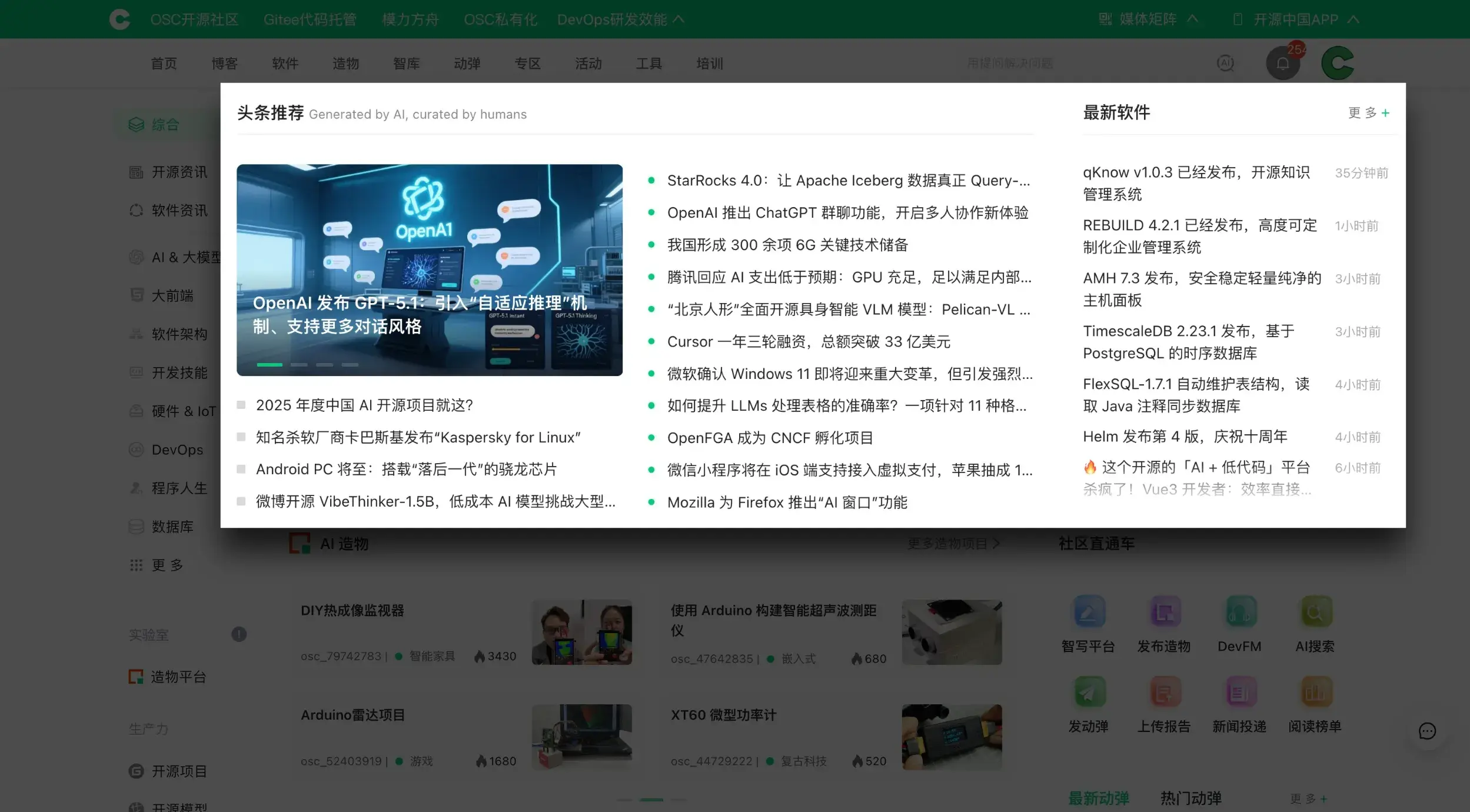 因此首頁 C 位非它們莫屬:「頭條推薦」+「最新軟件」。這是聚焦開源與 AI 領域的版塊,旨在為用户提供優質且實時的內容。