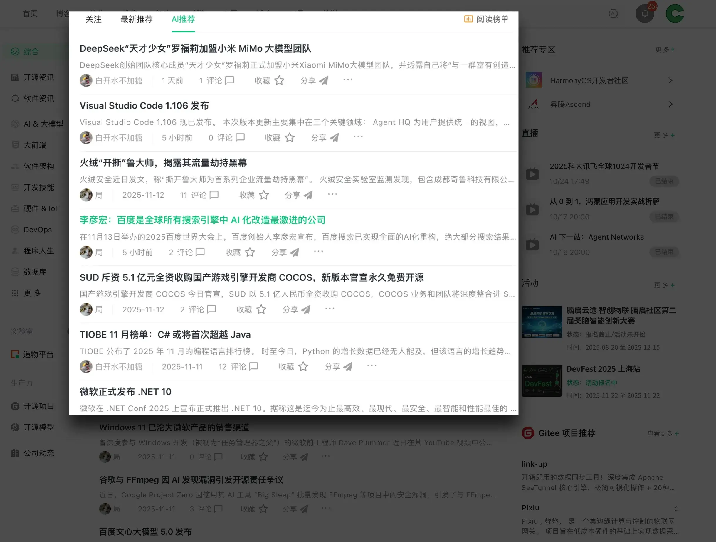 新版首頁上線了由開源中國社區 AI 推薦算法提供支持的「AI 推薦」功能。