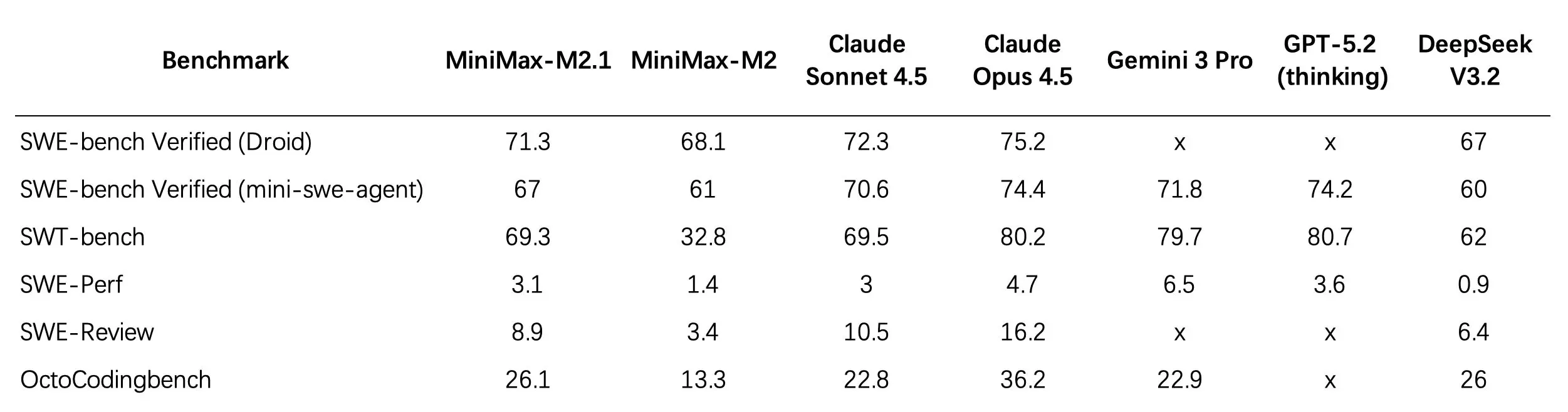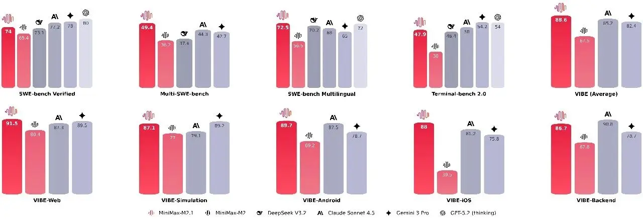 在 M2.1 中,我們致力於提升真實世界複雜任務中的表現:重點聚焦於更多編程語言和辦公場景的可用性,並在這個領域做到最好的水平。
